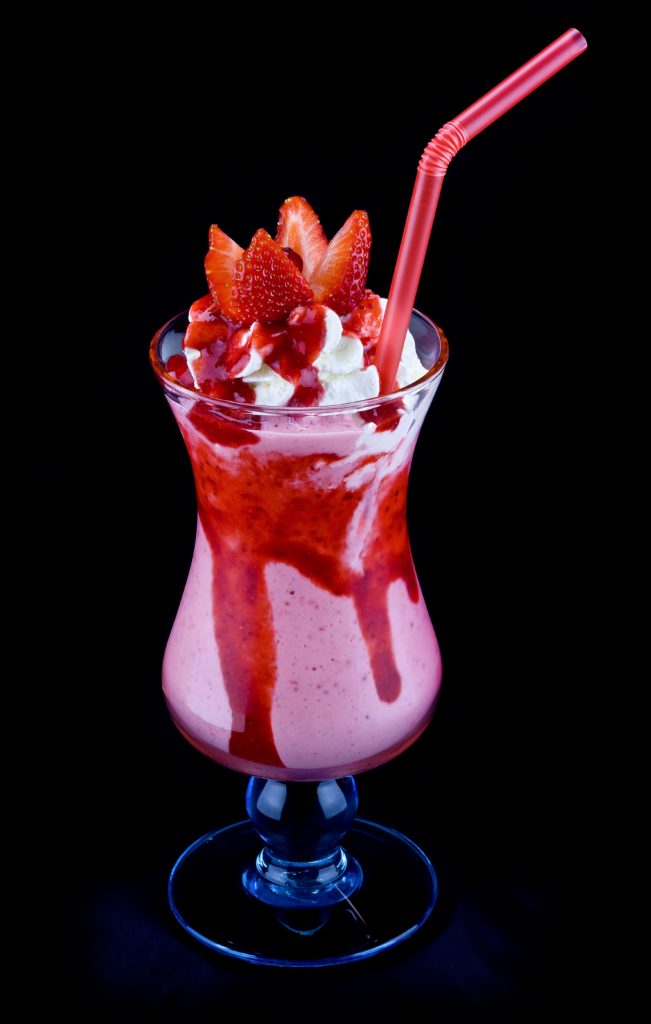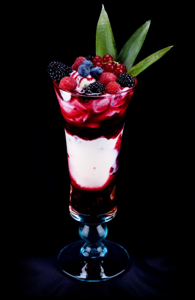 Joghurt Cocktail gemischtes Eis mit frischem Joghurt12, roter Grütze1, Heidelbeeren, Sahne, Himbeer- und Waldfruchtlikör und frischen Früchten dekoriert.