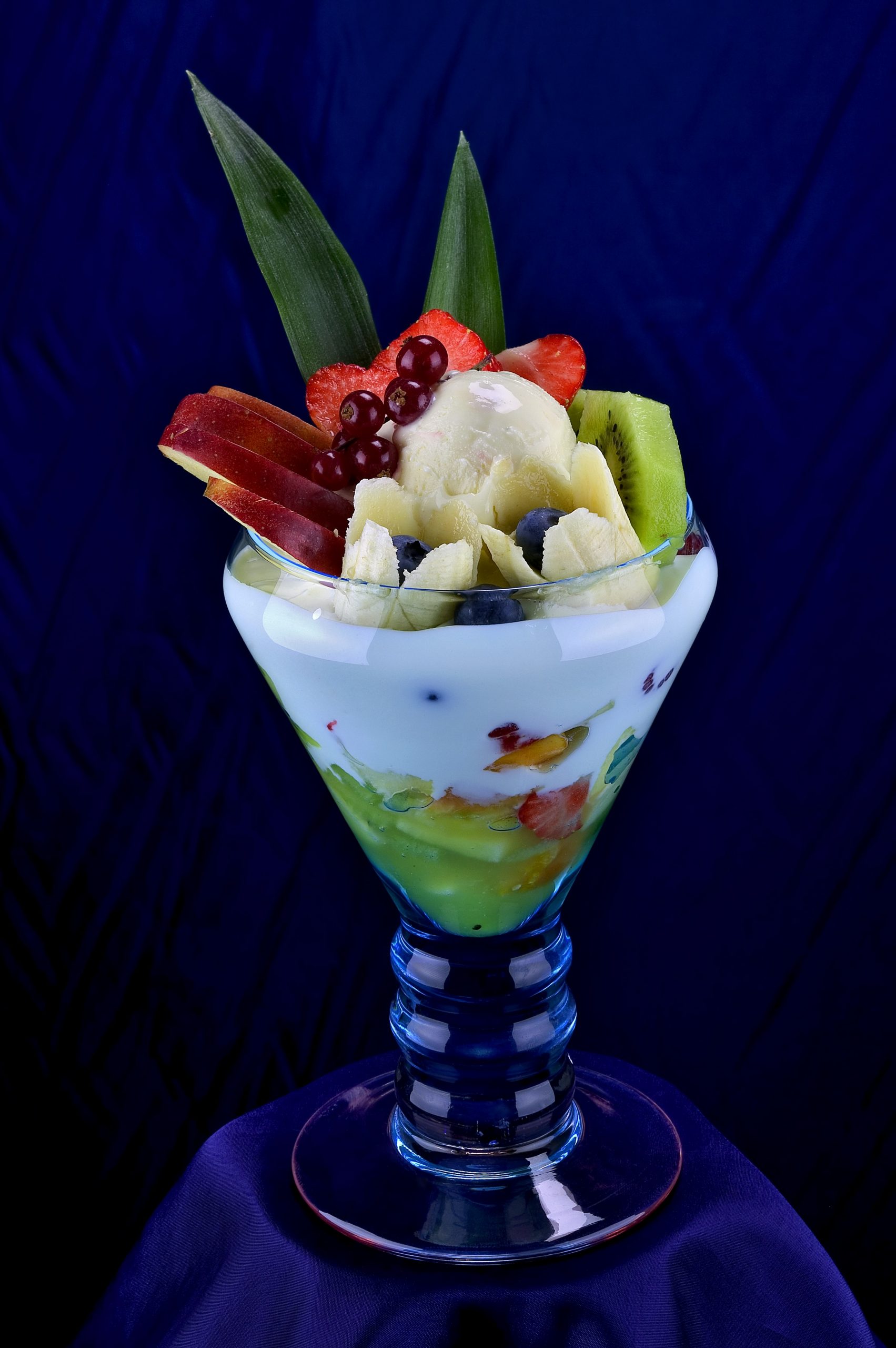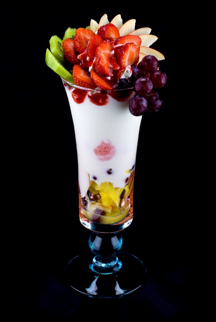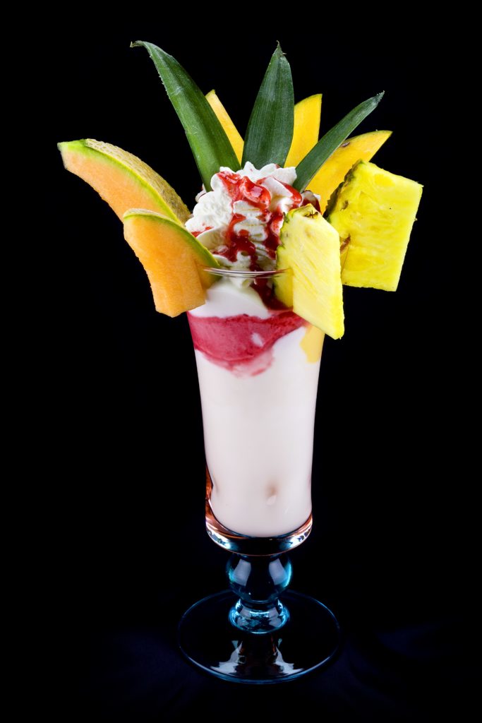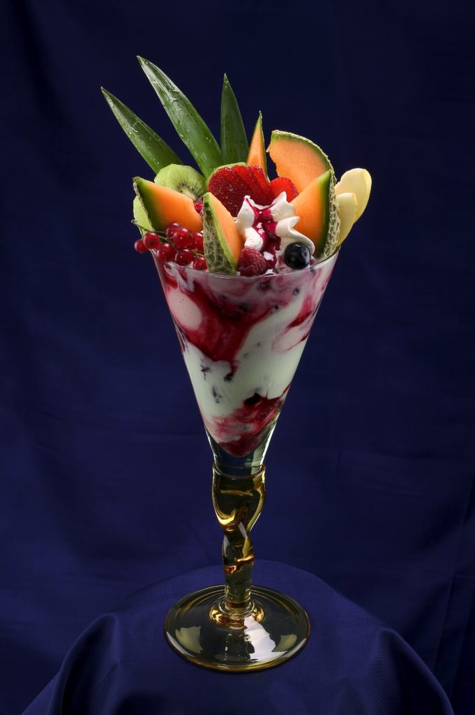 Joghurt Fantasia gemischtes Eis mit frischem Joghurt12, Obstsalat, Sahne, Erdbeersoße, Maraschinolikör und mit frischen tropischen Früchten dekoriert