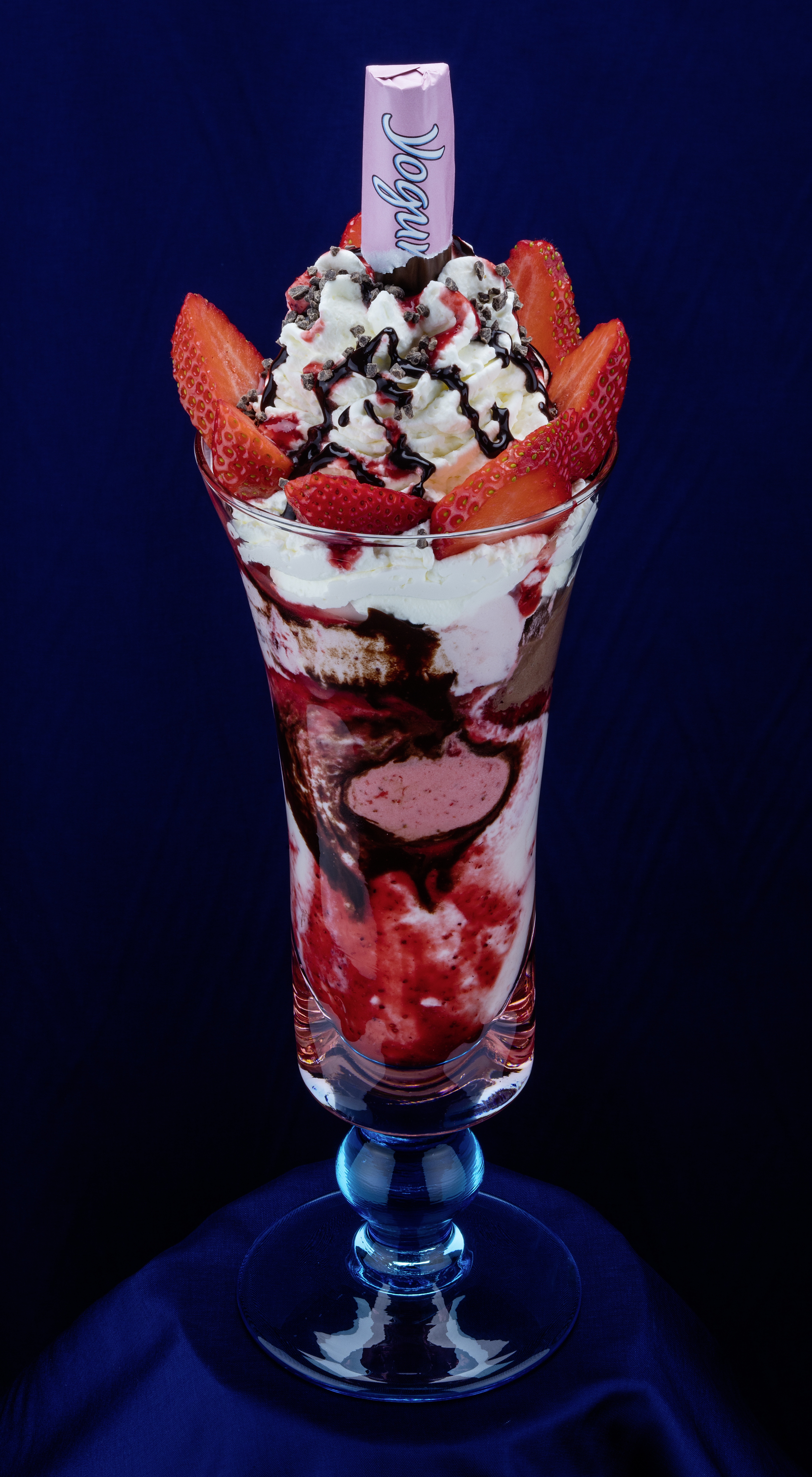 Coppa Yogurella gemischtes Eis mit frischem Joghurt12, Sahne, Erdbeer- und Schokoladensoße, Schokoladenraspel12, frischen Erdbeeren und 1 Yogurette7,11,12