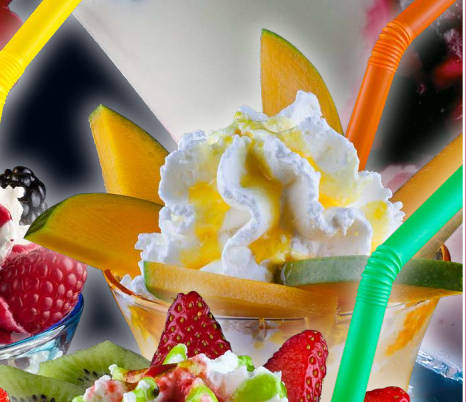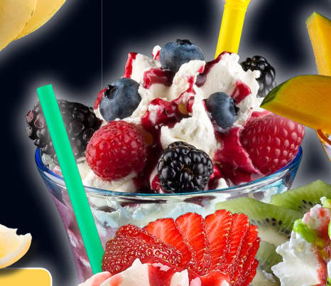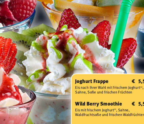 Joghurt- Spezialitäten Coppa Yogurella gemischtes Eis mit frischem Joghurt12, Sahne, Erdbeer- und Schokoladensoße, Schokoladenraspel12, frischen Erdbeeren und 1 Yogurette7,11,12 Joghurt Spezial Joghurteis12 mit frischem Joghurt12 und mit frischen Früchten dekoriert Joghurt Cocktail gemischtes Eis mit frischem Joghurt12, roter Grütze1, Heidelbeeren, Sahne, Himbeer- und Waldfruchtlikör und frischen Früchten dekoriert. Joghurt Fantasia gemischtes Eis mit frischem Joghurt12, Obstsalat, Sahne, Erdbeersoße, Maraschinolikör und mit frischen tropischen Früchten dekoriert Joghurt Tropical gemischtes Eis mit frischem Joghurt12, Sahne, Erdbeersoße, Maraschinolikör und mit tropischen Früchten dekoriert Joghurt Bio frischer Joghurt12 mit vielen Früchten, roter Grütze1, 1 Kugel Joghurteis12 und Waldfruchtsoße Joghurt Frappe Eis nach Ihrer Wahl mit frischem Joghurt12, Sahne, Soße und frischen Früchten Wild Berry Smoothie Eis mit frischem Joghurt12, Sahne, Waldfruchtsoße und frischen Waldfrüchten Italia Smoothie Eis mit frischem Joghurt12, Sahne, Erdbeer- und Kiwisoße¹ und mit frischen Erdbeeren und Kiwis dekoriert Tropical Smoothie Eis mit frischem Joghurt12, Sahne, Tropicalsoße1 und tropischen Früchten dekoriert